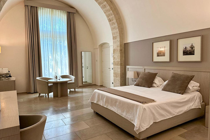 Our taxi dropped us off in Borgo Nuovo, the more modern part of the city. We were staying at Relais Histò San Pietro sul Mar Piccolo, a luxury hotel located just outside the center, about 15 minutes’ drive from the historic core.